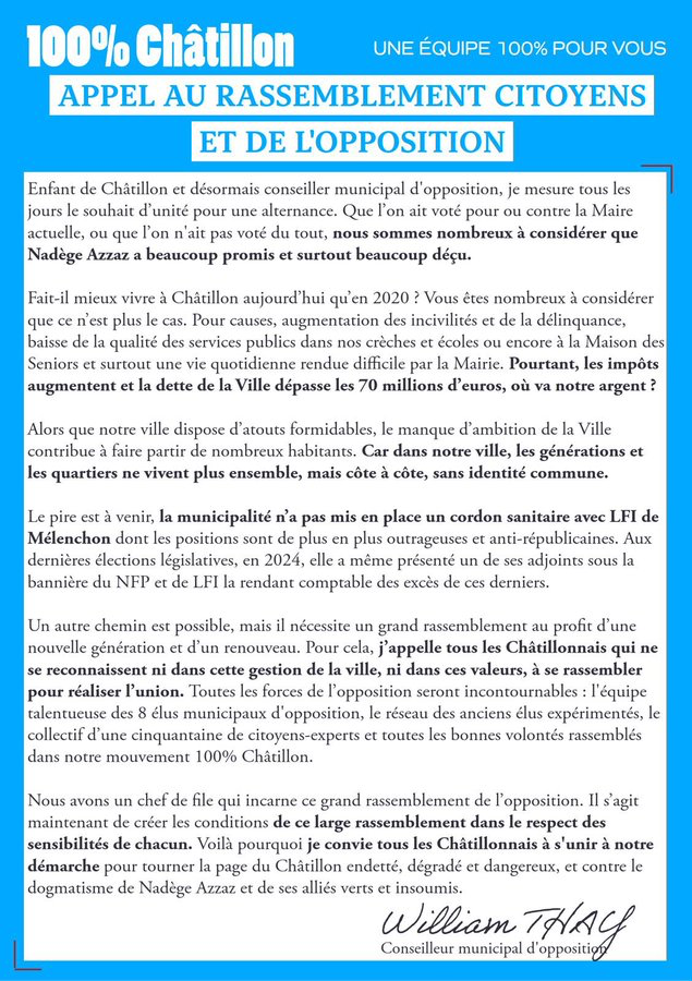 À l’aube du 18 juin qui marque l’anniversaire de l’appel du Général de Gaulle pour s’unir dans l’action pour libérer la France. Nous appelons tous les Chatillonnais qui ne se reconnaissent ni dans la gestion de la ville, ni dans ces valeurs, à se rassembler pour l’Union !