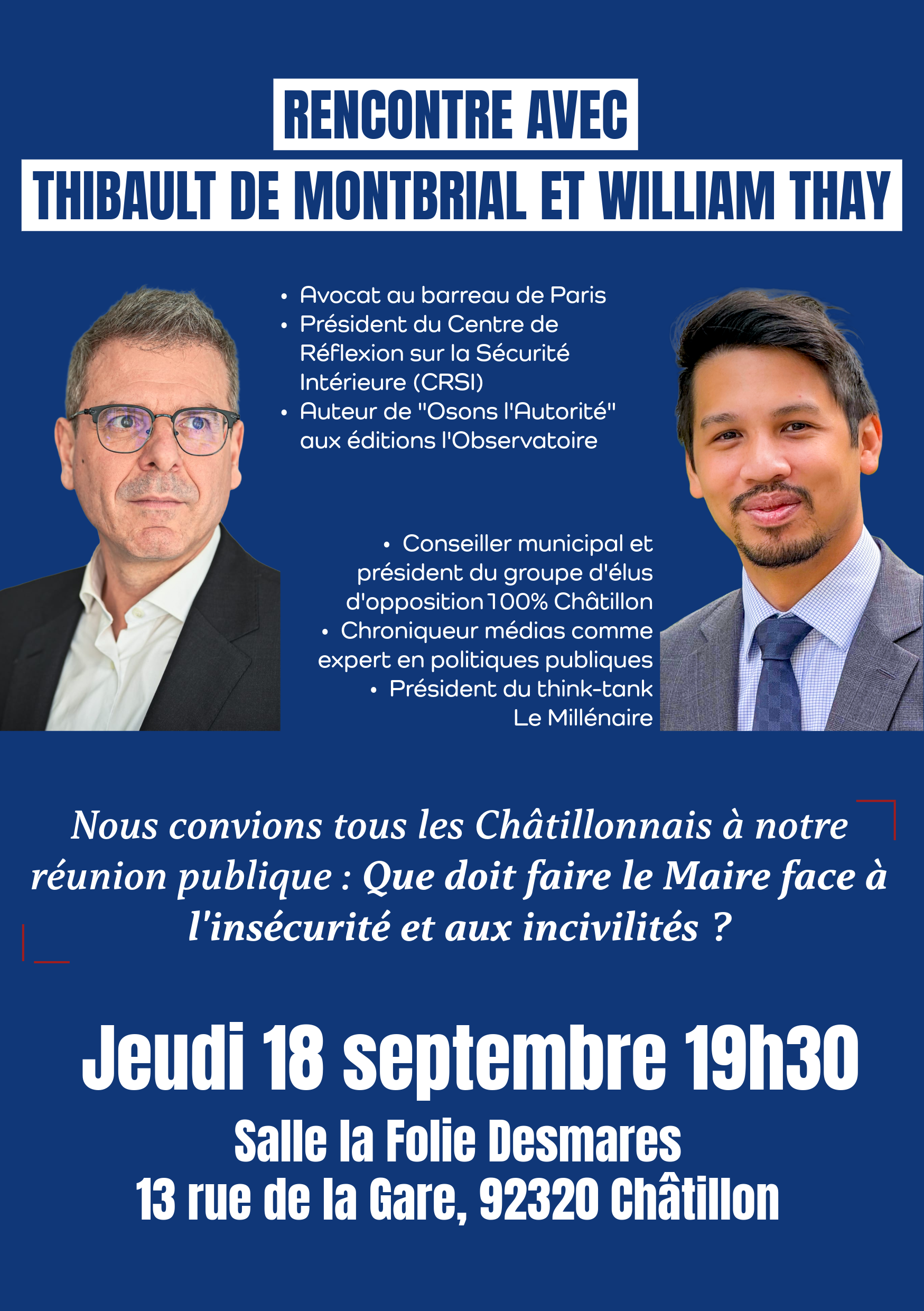 L’équipe de 100% Châtillon vous convie à une rencontre publique à la Folie Desmares le jeudi 18 septembre 2025 à 19h30 en compagnie de Thibault de Montbrial et William Thay